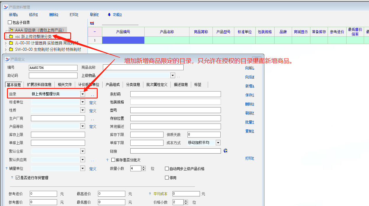 建议:增加,新增商品时限定目录功能,可以按照不同的人员授权不同的目录。或者不限制目录。具体看图片。