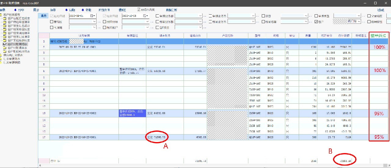 图例如下,数值A当然不等于数值B。但是因为客户对账明细表里没有反应出整单折扣的数值,给对账人员对账时带来困惑与不便。 |