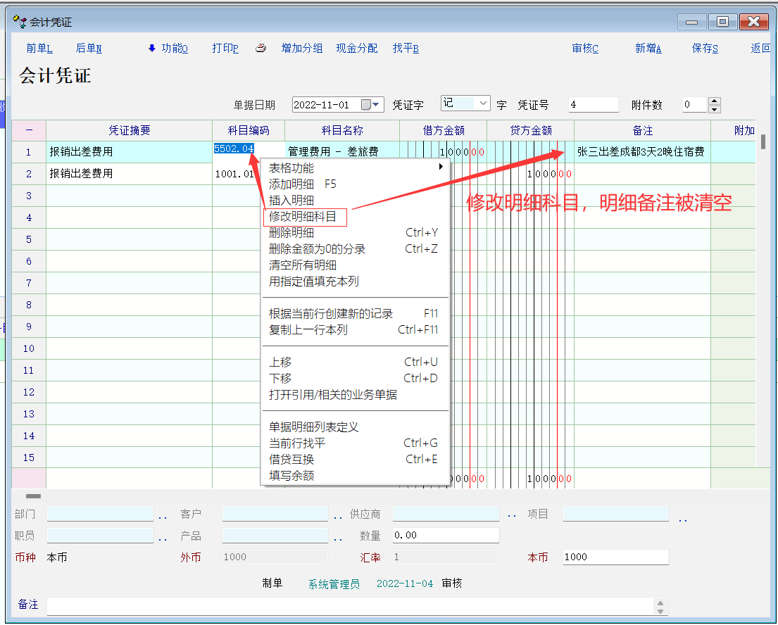 备注是明细备注,点右键修改明细科目还是直接修改科目编码,都是清空了。(其他收款单、其他付款单、会计凭证三种单)