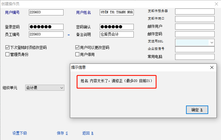 老师,越南文姓名有的会超过20个字符,目前限制只能20个,例如:NGUYỄN THỊ THANH NHàN 就是21个字符,希望老师能增加操作员字符数,谢谢!