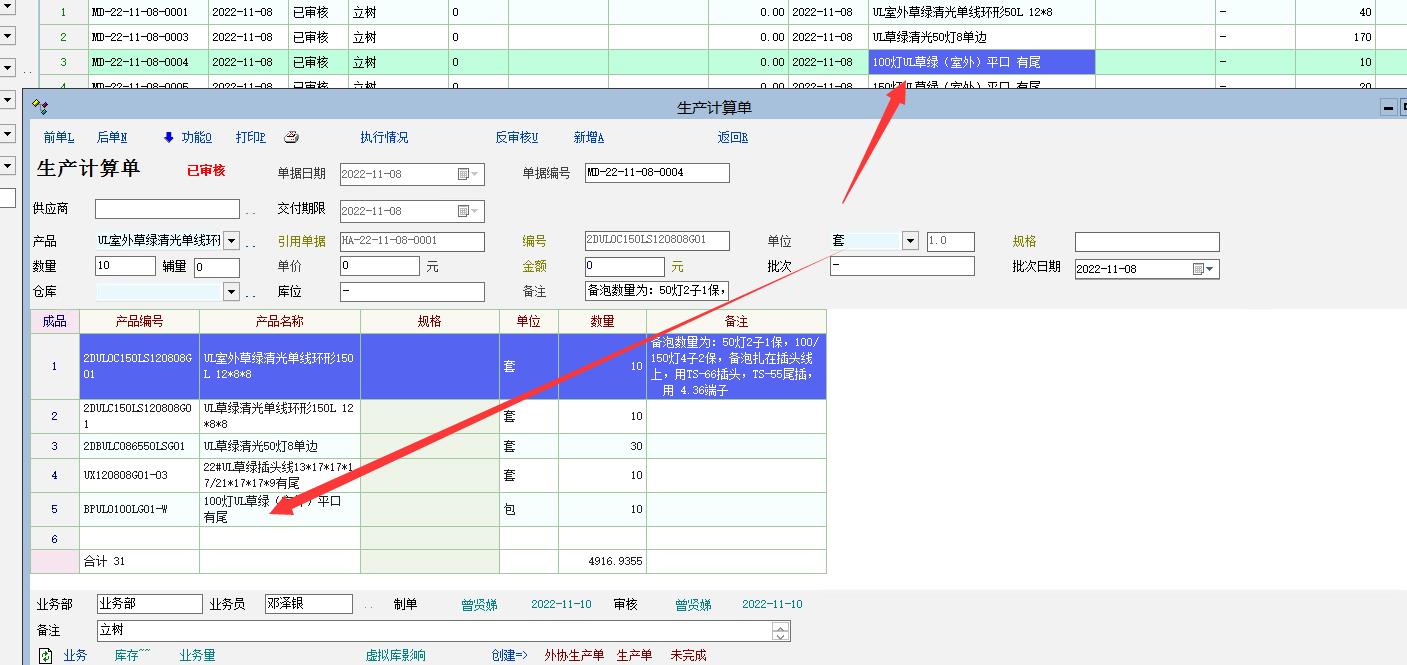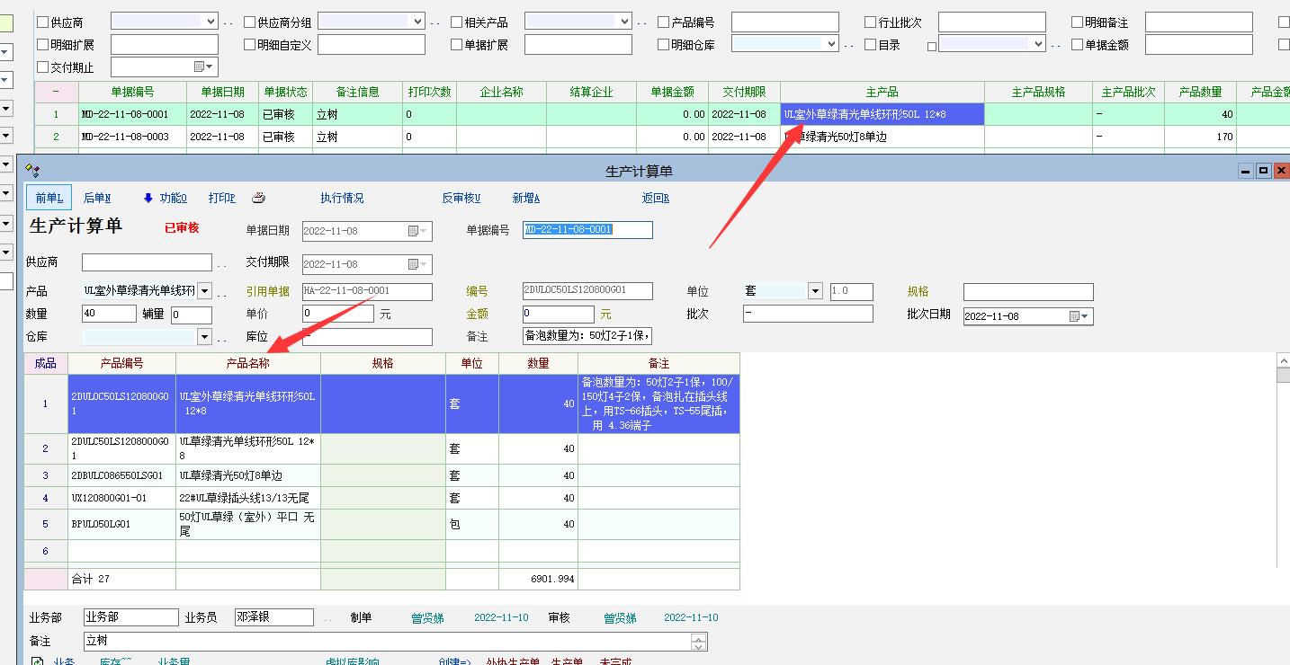 刚才看了一下,多级展开后的生产计算单单据列表只显示其中一个主物资和明细,建议这种情况直接在生产报表-生产计算单明细里面去查看