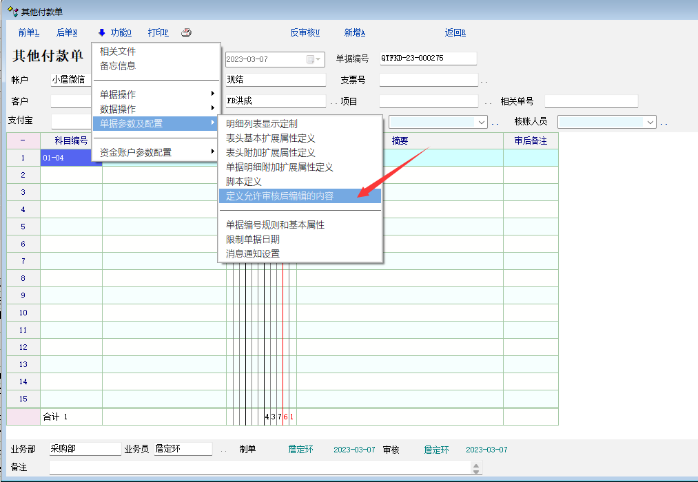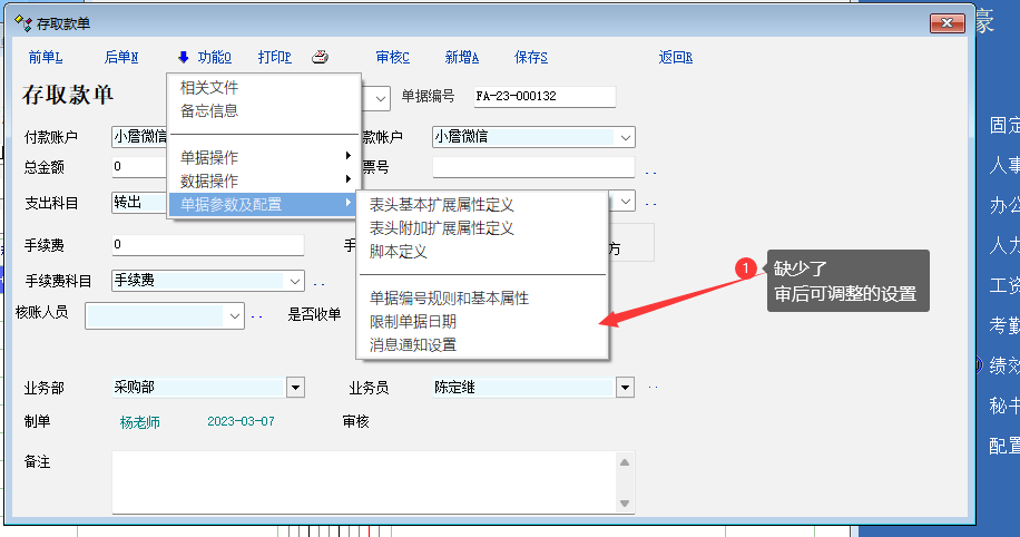 1. 如图, 现在存取款单缺少了 审后可调整的设置选项。