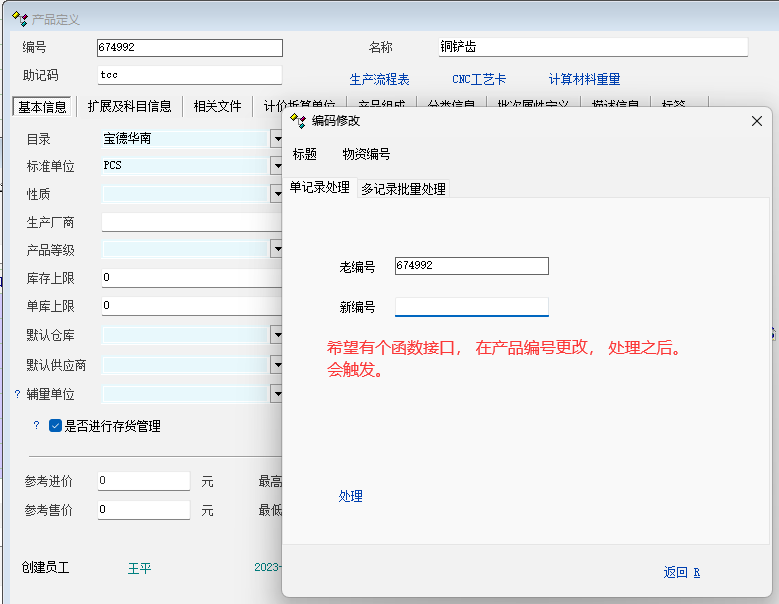 但是希望实现 , 在更改产品编码时, 会提供消息通知相关人员, 产品编码原编码,新编码,或者有其他相关单据的某些旧编码需要更改。