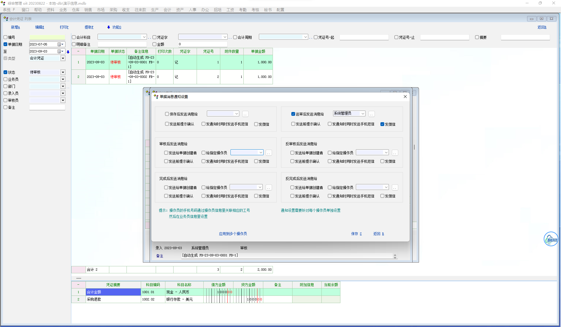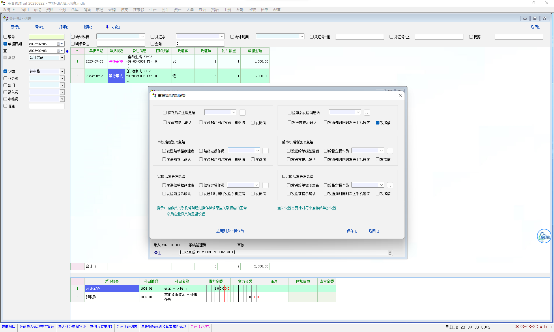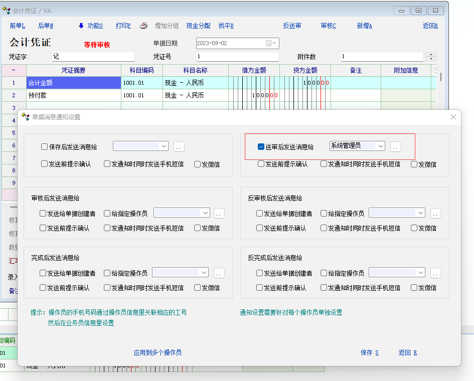 1:会计批量送审报错问题,        经验证应该是勾选了(送审后发送消息给**)取消了勾选报错问题就解决了,验证版本共3个版本-20230822/20230718/20230302,还请老师验证下,谢谢