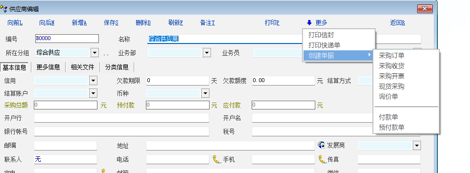 4:在供应商资料创建单据中添加完整的采购单据,缺少计划单,发票,申请单,退货单,添加往来款单据应付款单,应付核销,,还请老师考虑下,谢谢