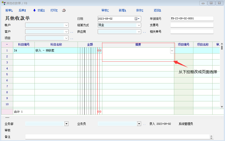 5:将其他收付款的摘要选择从下拉框改成选择页面,已应对摘要过多下拉框选择麻烦的问题,还请老师考虑下,谢谢