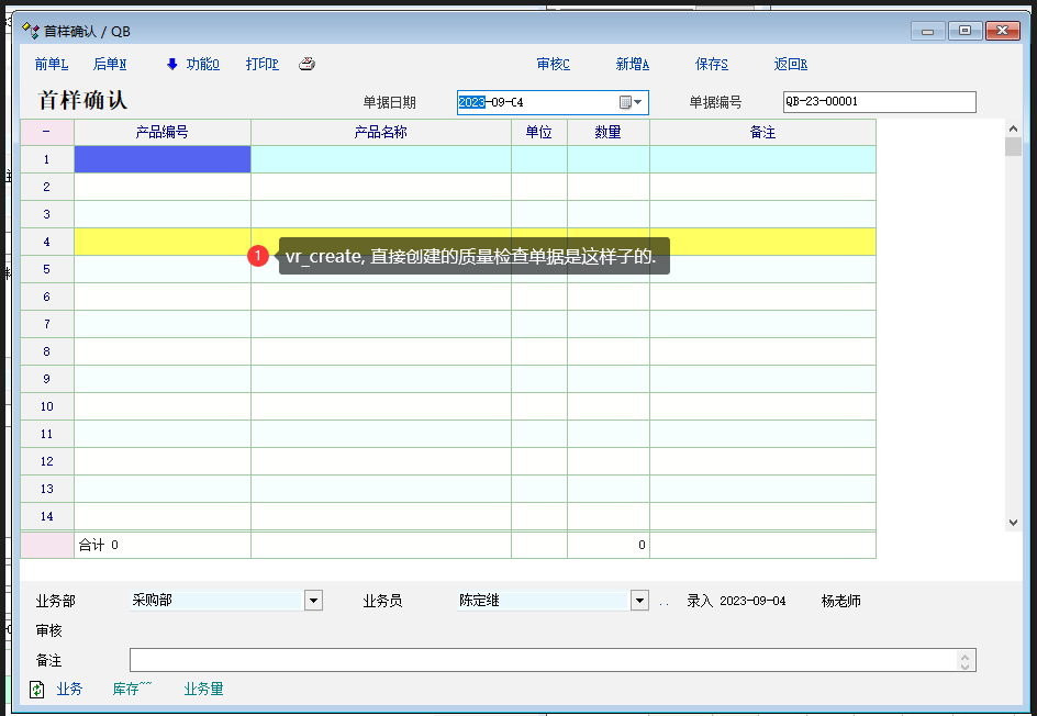 业务场景: 客户要启用一个生产首样确认的检查, 和默认的质量检查不一个单据. 启用了一个质量检查单据, 并没有配置引用流程, 但是按F6出现的是和质量检查一样的设置. 建议: 1. 引用流程单据定义 2. 启用的质量单据的扩展属性 和 自定义属性, 和默认的质量检查单据也共用了. 3. 添加脚本函数方法, 直接创建/打开质量检查单据 vr_create('QB'), 不好使.看效果图 详细看图. |