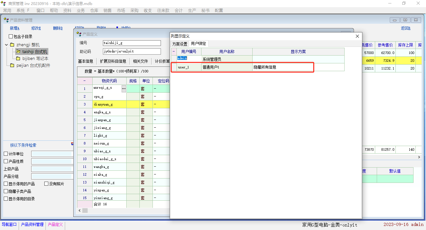 1、产品组成-显示定制-新增方案:隐藏所有信息,在 用户绑定 绑定user1 显示方案为:隐藏所有信息。