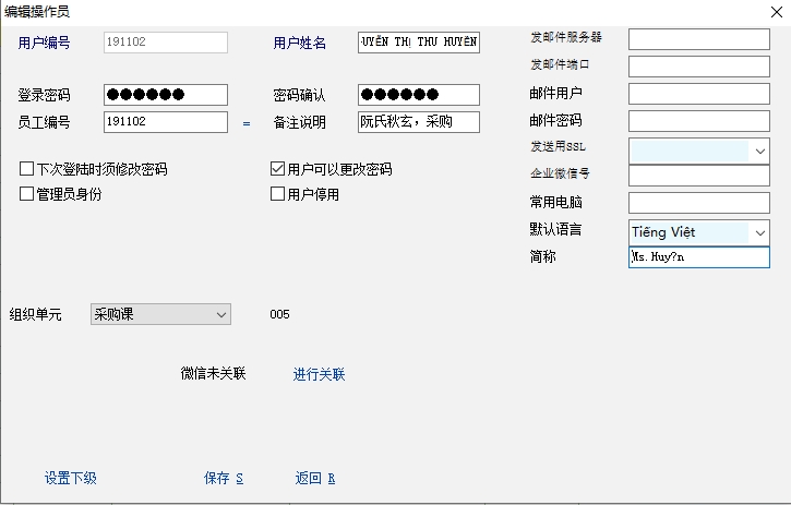老师,我添加了操作员扩展属性定义:【简称】,用来记录采购员在采购订单上显示的简称,输入的越南文简称显示乱码,希望能正常显示越南文,谢谢!