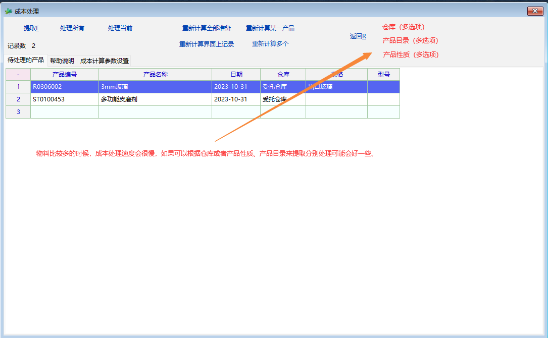 在物料比较多的时候,成本处理的速度会很慢,如果可以增加选项,根据需要选择相应的仓库、产品目录或者产品性质单独处理,效率应该会高一些。