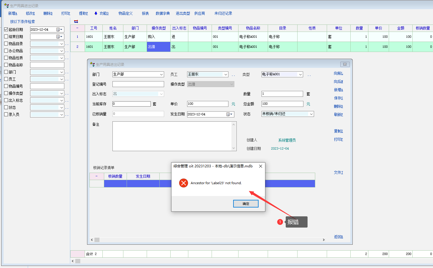 1 出借了一台电子称, 在归还核销时, 右键创建核销记录, 报错. 没有界面.