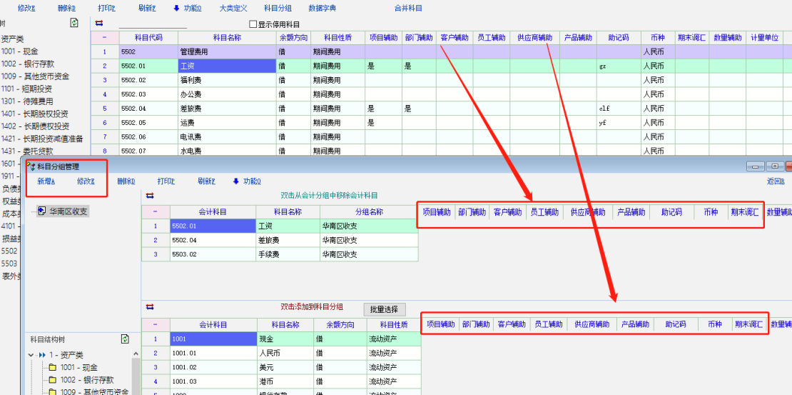 建义会计科目分组界面,会计科目内容增加显示“项目核算”、“部门核算”“员工核算”、“客户核算”等。因为明细科目较多时,设定分组需要查看是否设错设漏,或者查对时有些科目没有设“项目辅助”但在分组时却又选了该科目入该组别,统计时却没有数显示。