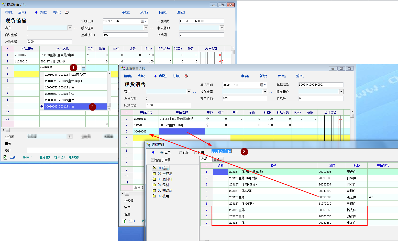 2023-12-26最新版本,快速检索面板,在遇到存货编码不同,存货名称相同的情况下,回车域者鼠标点击都会弹出产品选择窗口,让用户再次选择物品。