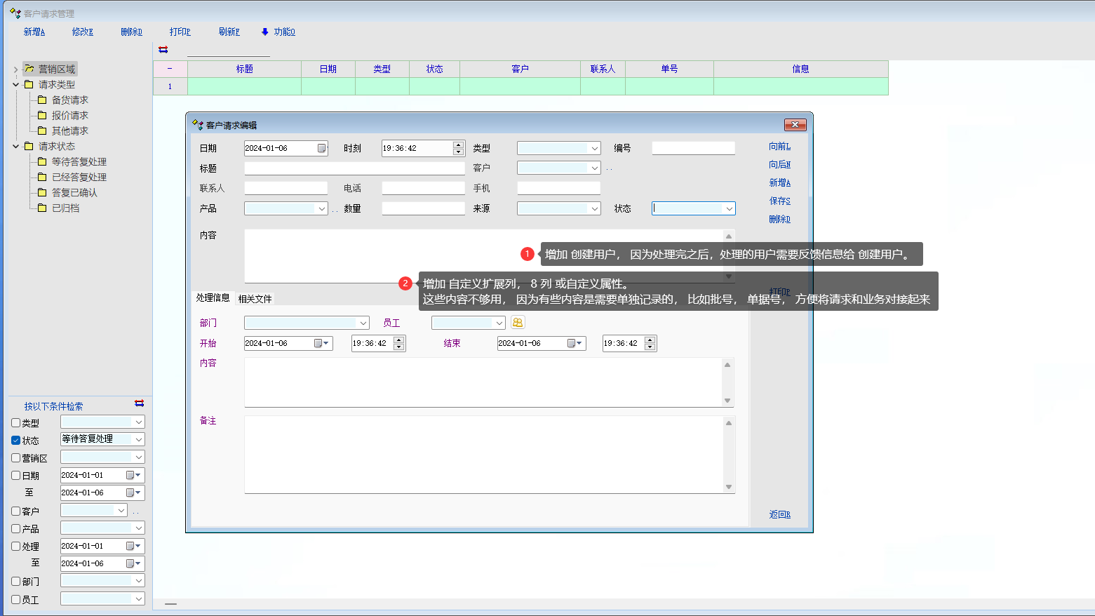 业务场景: 客服针对客户下的订单中的产品(需要批号, 订单号,生产要求等)发生的问题, 登记; 咨询生产相关人员, 要求生产相关人员提供答复的过程; 建议: 1 增加创建用户, 创建用户发给解决问题人员, 解决问题人员回复之后,需要再反馈通知到创建用户。 2 增加自定义扩展列,方便业务单据对接。 3 左侧检索条件增加 创建用户。 |