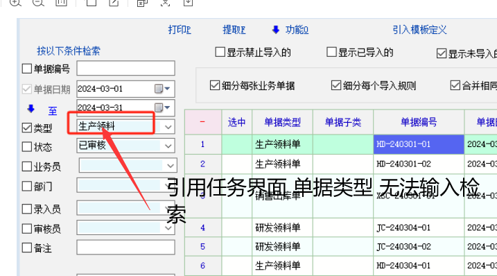 引入单据任务界面,单据类型无法输入检索。
