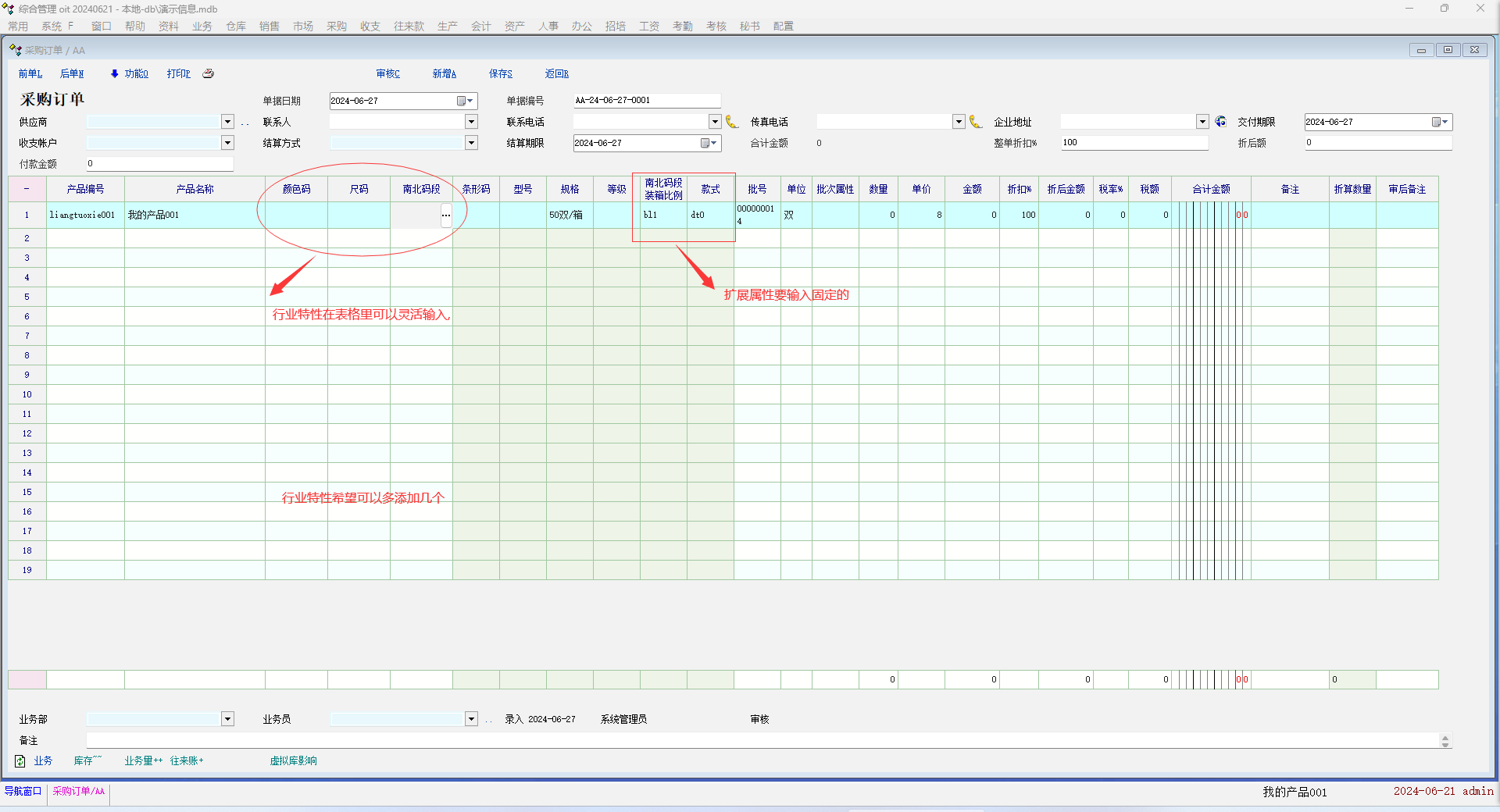 行业特性在单据输入时可以灵活选择,而扩展属性是固定保存在产品资料里,受行业特性最多3个限制同货号产品需要创建很多不同属性的同货号商品,