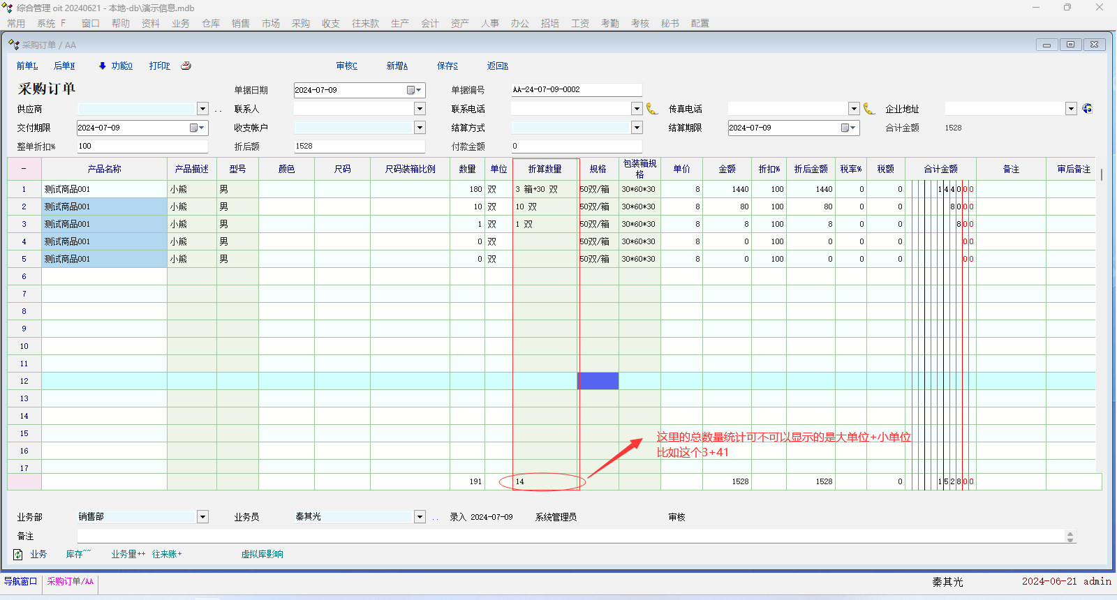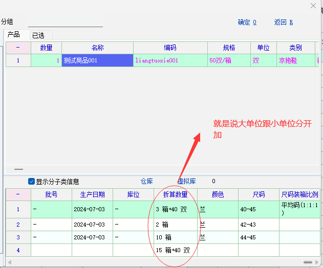 各个产品折算单位不同,,折算数量可以不显示单位直接显示几加几 , 主要做总数统计