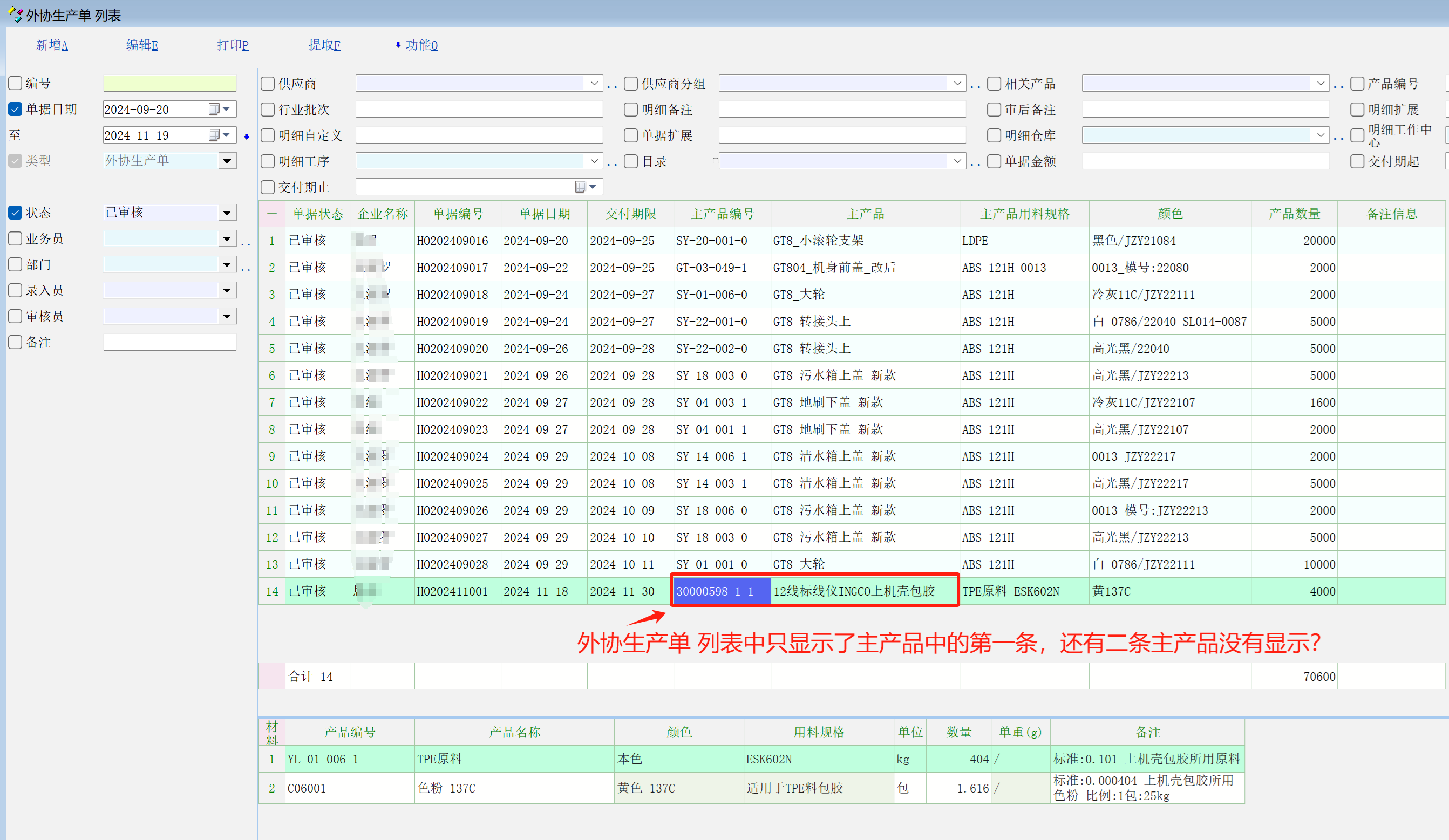 求助_外协生产单中主产品有三款,但外协生产单列表中只显示主产品中第一条_产供销