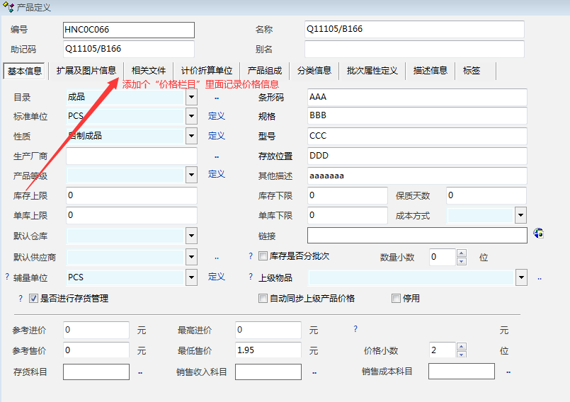 3,产品资料里面直接添加单价----用于参考零买等采购或者销售或者没有价格体系的客户
