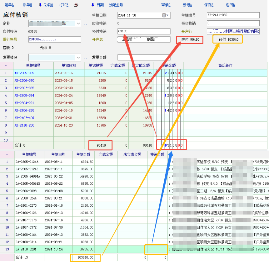 建议”应付核销“和”应收核销“增加关联核销对应的”预付款“和”预收款“单号和核销金额。