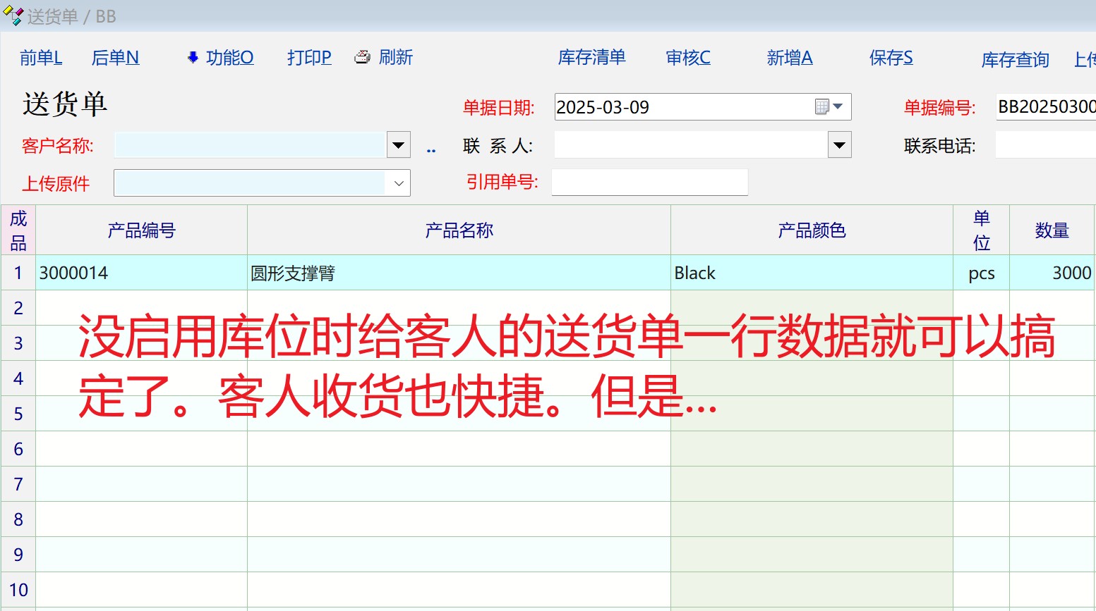 我司仓库一定要用库位管理,但在启用库位后我现在碰到的问题是图2的效果,一张送货单上同一款产品要列出多行,因有库位列需要填写;