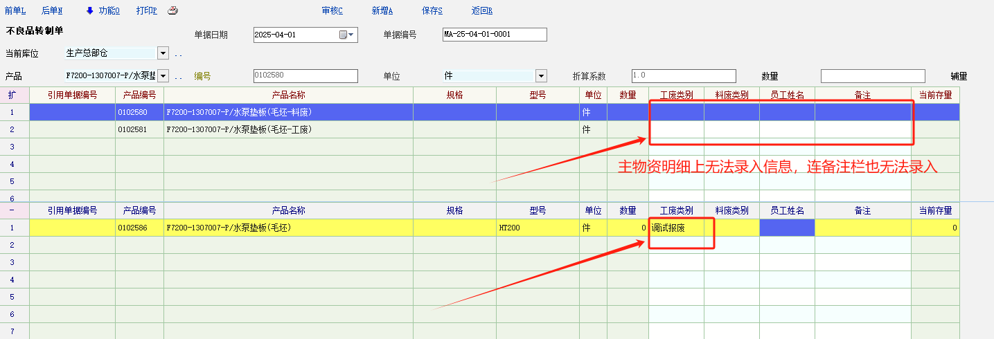 在转制单据明细里,物料转换操作时,只能在明细资料栏里录入,主物料明细栏无法操作录入信息,在转制过程时有需要主物料的信息记录,请软件方给予解决。谢谢