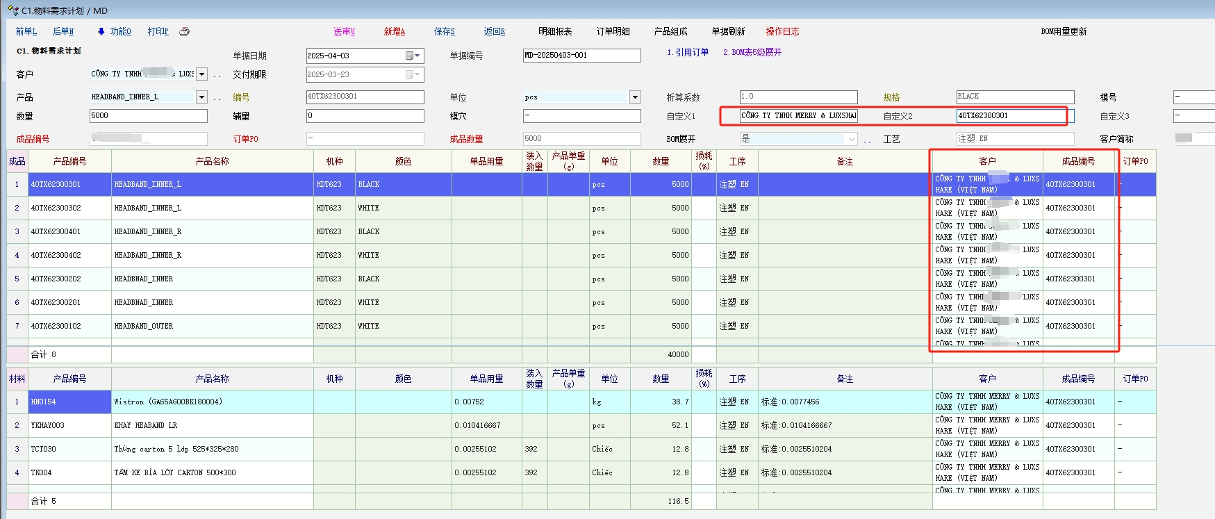 主物资要录入额外的信息,用明细自定义列来输入,在业务规则里面显示出自定义列,选中主物资行,在表头的自定义列就能输入了