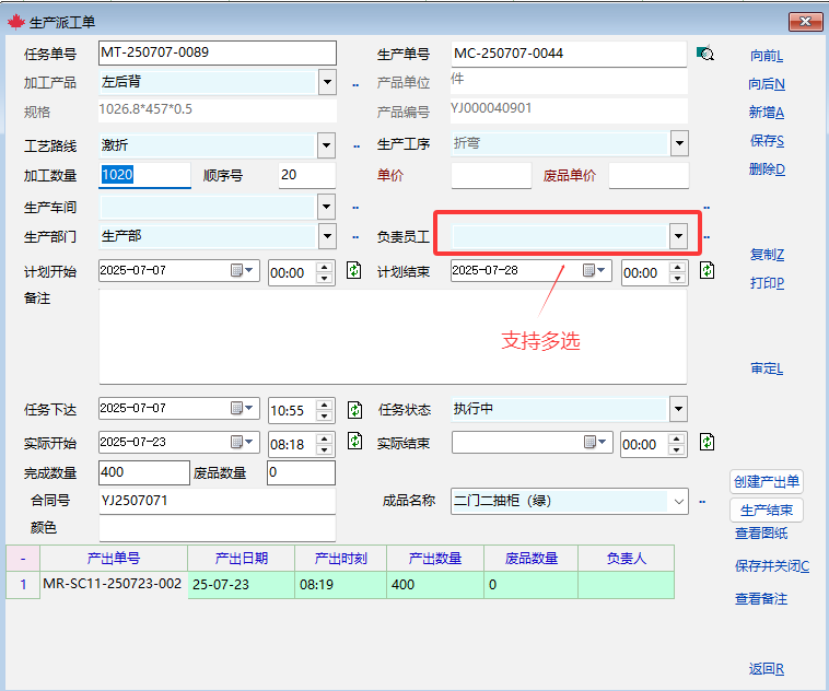由于某些部件必须是两个或者多少员工协作才能完成,工序任务单和产出单中“负责员工”目前只能单选,希望改为多选。