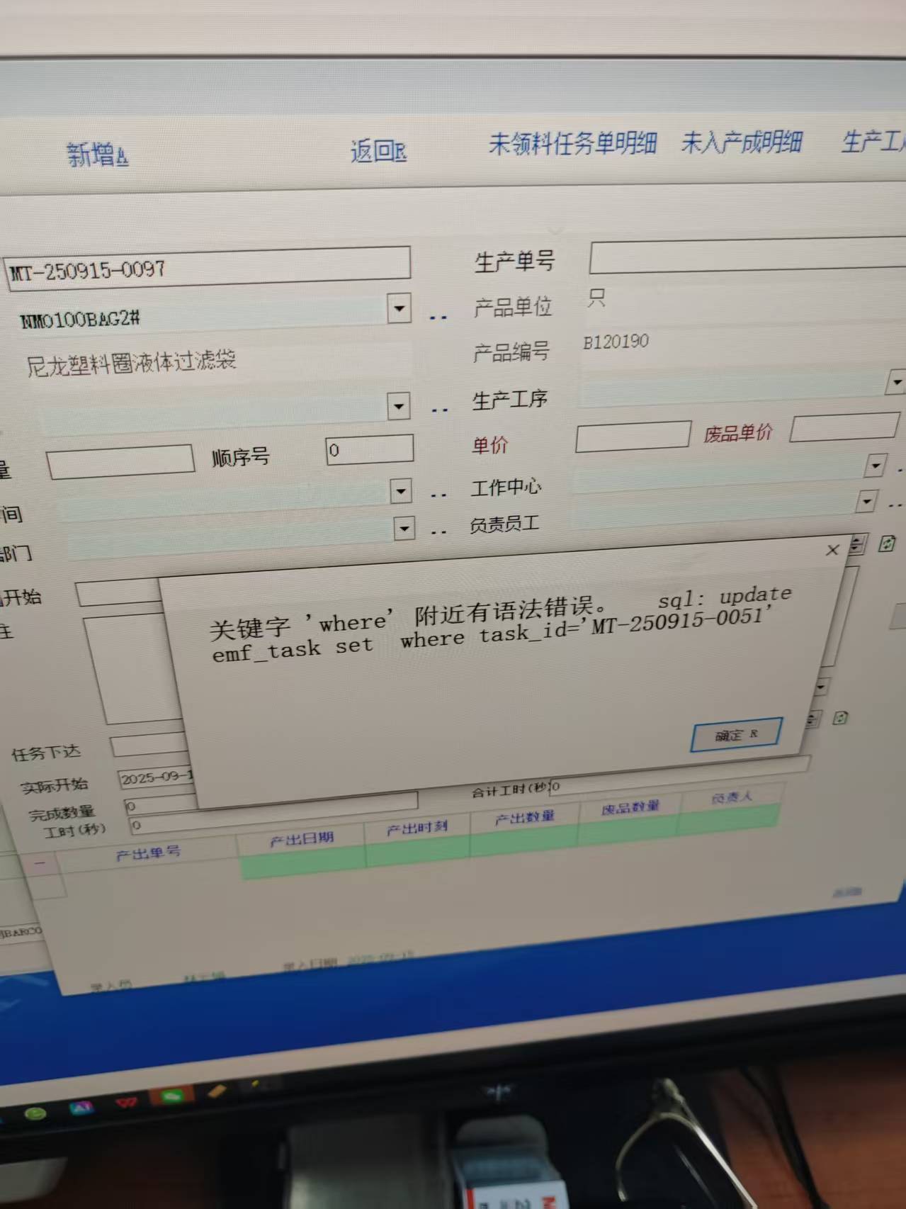 打开 生产任务单里  工序任务时报错  这个问题一直存在很多客户反馈过,时不时出现。   sql:update附近有语法错误。where task id='MT-250915-0051关键字,where emf task set。