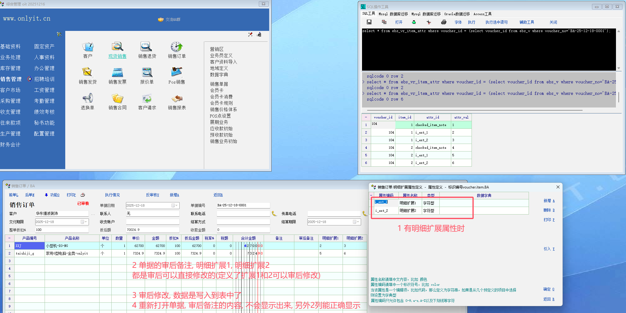 1. 单据没有自定义明细属性时, 审后备注是能正确显示的 2. 单据添加明细属性后, 表格列能显示, 也能修改, 但是切换单据之后, 就不会正确显示审后备注内容了 个人估计是当有明细扩展列定义的时候, 直接以这个为准了, 就将单据默认的审后备注一列丢失了. 导致数据没有正确组装审后备注的内容. 详细看图: |