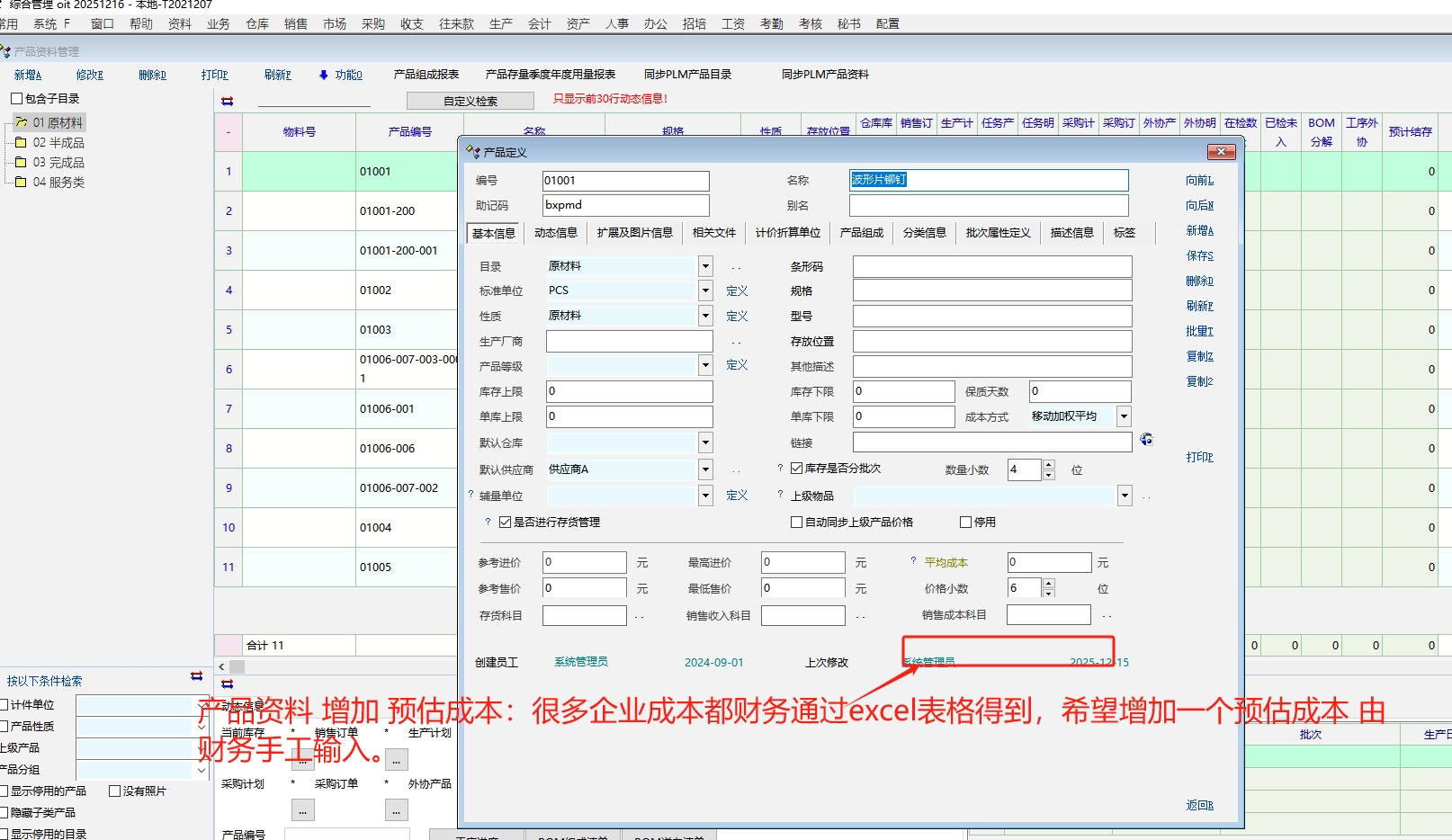 产品资料 增加 预估成本: 很多企业成本都财务通过éxcel表格得到,希望增加一个预估成本 由财务手工输入。