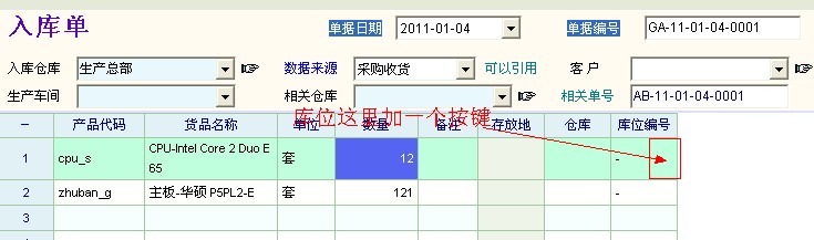 现在单据明细里的库位编号是手工入的虽然灵活但是记忆大,能不能单据明细里的库位编号和库位进行连接,在库位编号旁边设置一个按键连到库位界面 选择已定义好的库位自动填入库位编号 。