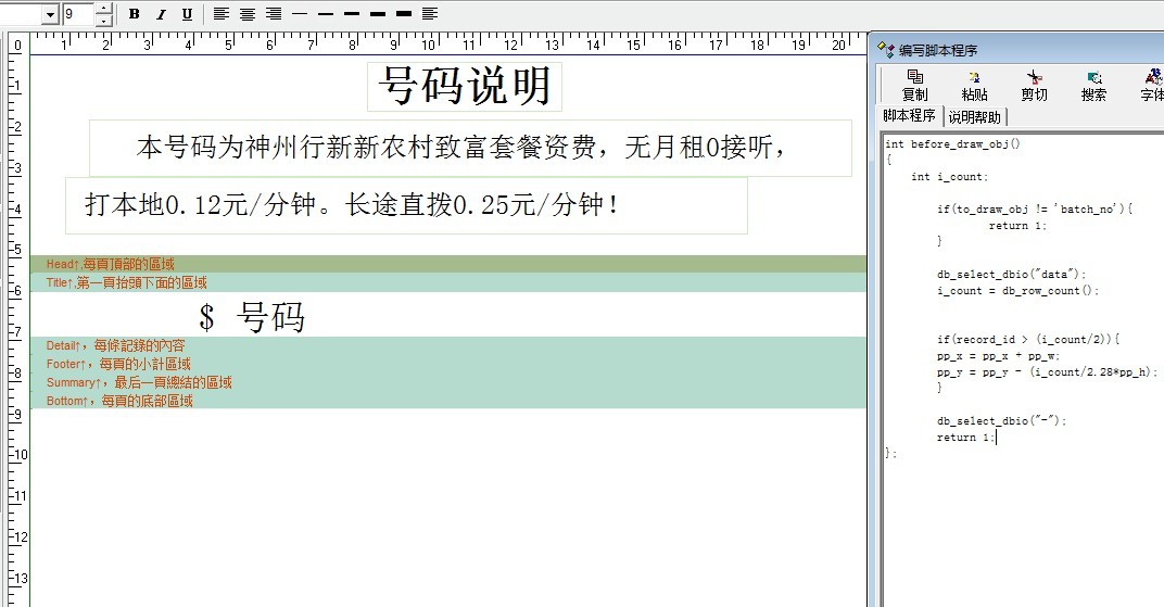 此打印脚本适用于通讯行业及电子产品唯一码、批次号、串号等产品的并列打印。可根据需要稍微修改一下参数。方便采购之后立即打印。使用此脚本必须采用20110902之后的版本,旧版本暂不支持。