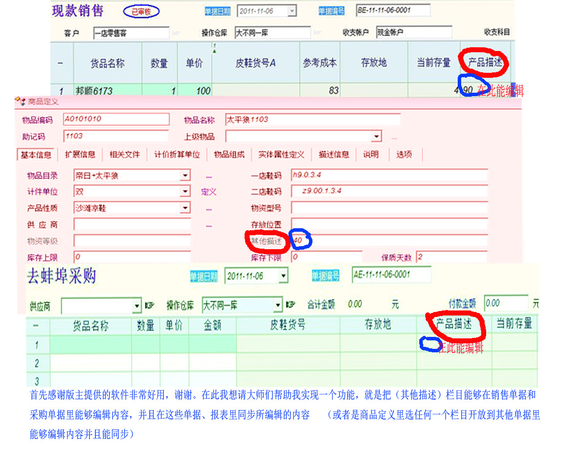 我是想要这个描述在其他单据里能够编辑内容,并且编辑之后能使其内容在各单据里都能同步内容,这样我用他作为皮鞋尺码的栏目使用,在进出帐单据里填写起来就方便多了 |