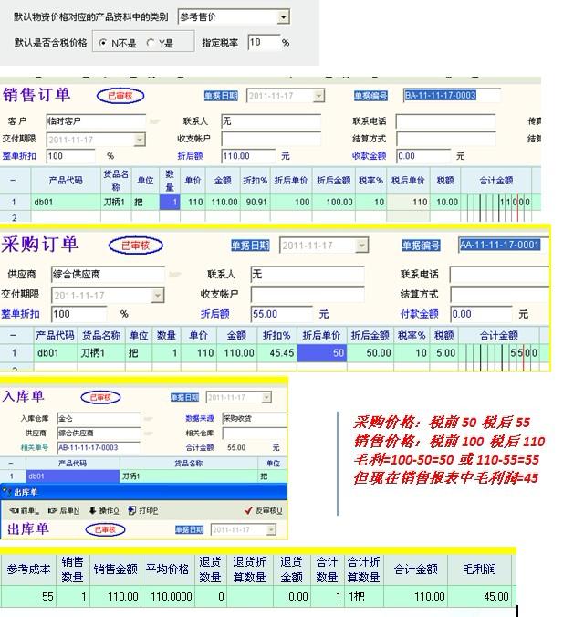 销售与采购单都要有税前、税后、税值三个数据;
