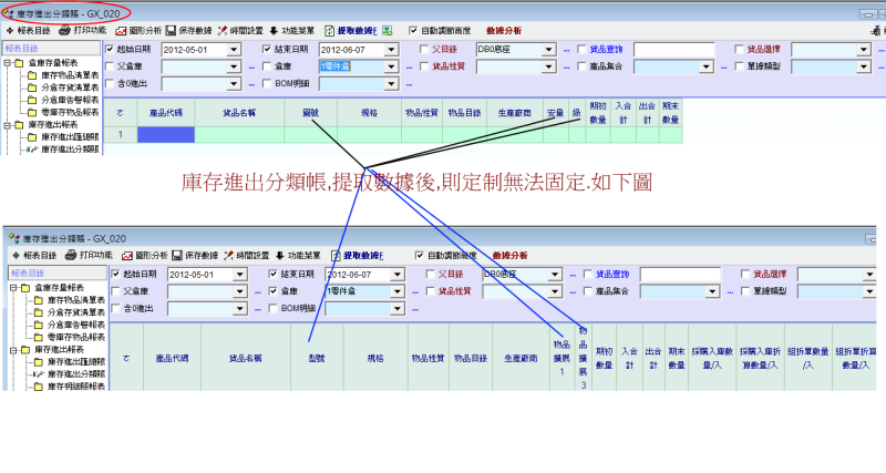 四.庫存進出分類帳GX_020,提取數據後,定制會跑掉.如下圖