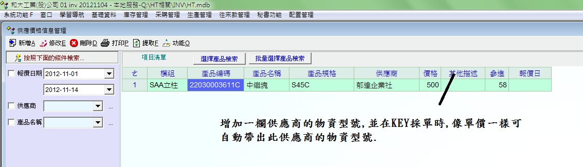 老師, 一.庫存存量報表沒有辦法檢索數量. 另外進出報表的數量只有單選,沒法複選. 二.因為A料號,有可能分別跟2家廠商購買.EX:A廠商,可能叫CCC,價格5000.B廠商可能叫AAD.價格4500. 所以希望在供應商價格管理中,可去設定相關資料.這樣在KEY採單時,選A廠商時,即會SHOW出CCC及價格5000. |