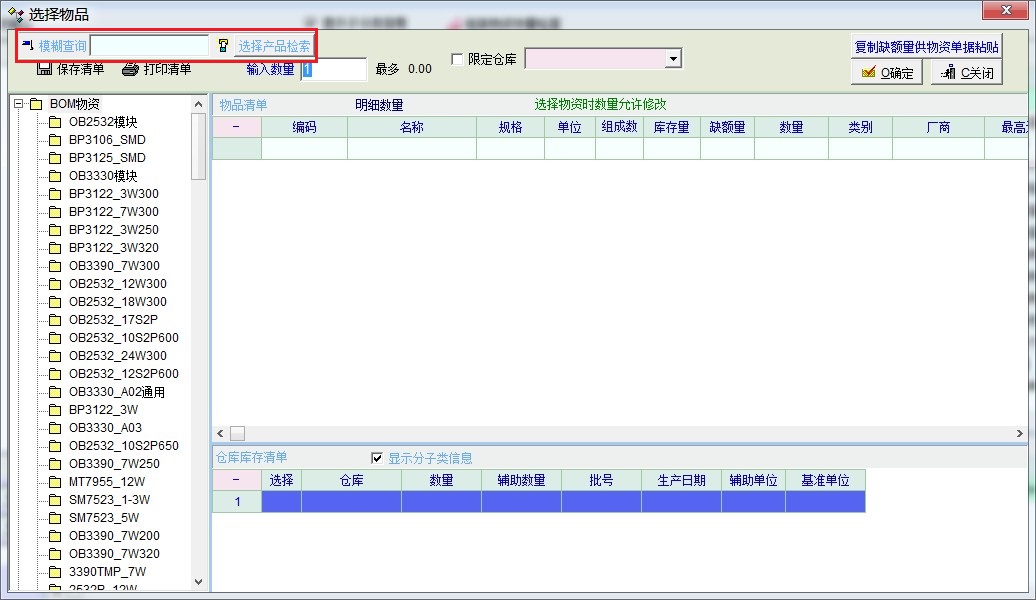 这个功能需要增加,就是增加一个或几个输入框,自己录入料号或型号,因为BOM物资多了,要一个个去找所要组装生产的很麻烦,