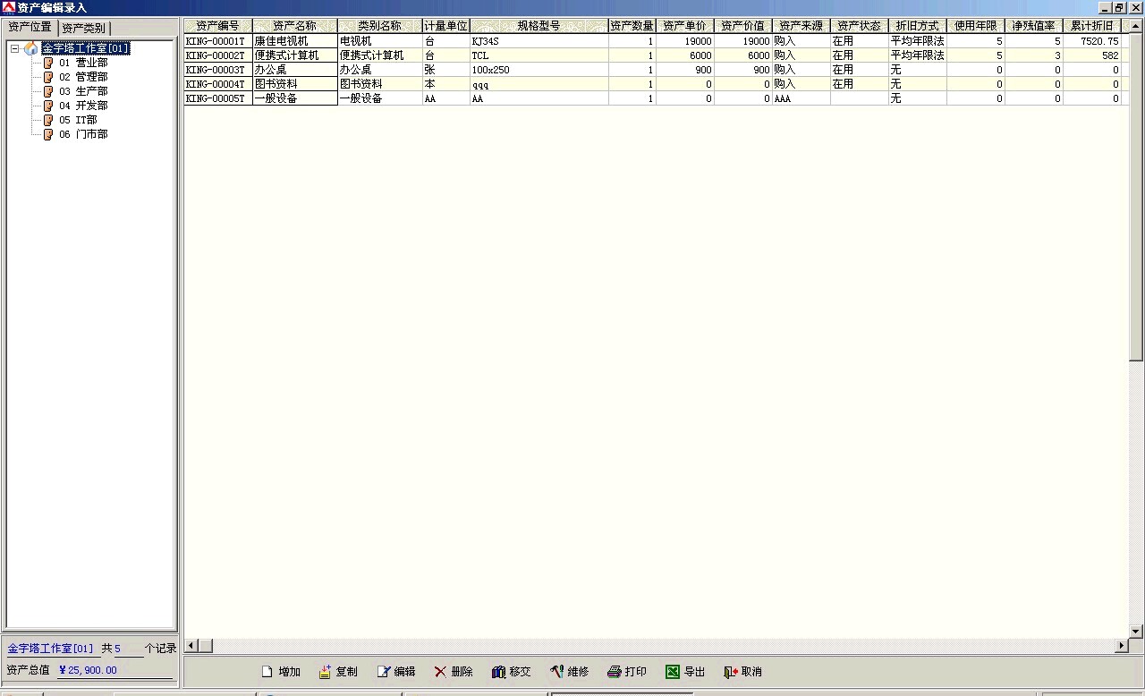 这个软件默认是按资产类别查询对应的资产清单,如果要查询某个部门或者某个公司的话,需要输入条件进行选择。看我们这个软件能否直接显示部门列表,然后用户点击某个部门,右边的窗口就直接显示该部门所有资产。