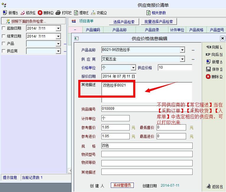 请问价格信息或在【产品定义】--【分类信息】--【其它描述】中,可以把【其它描述】打印出来,这样做的好处,是同一种产品,不同供应商叫法不一样,如果使用另加字段,打印表单会很长,为了方便收货,发现这里设置不同供应商的名称叫法最适合不够了,请问如何操作,谢谢