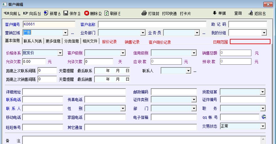 我们是做贸易的,整天的工作都围绕着客户(供应商)询价,报价,下销售(采购)订单,开销售(采购)单转,所以,在跟客户(供应商)接触、交流时,查询该客户(供应商)的历史询价、报价、交易记录就成了必不可少的,而且非常频繁的操作,但在系统中这些操作都是《分类信息》的下级操作,每次都要打开客户管理后,再点击分类信息,然后才能查询具体的内容,建议老师将这些操作直接放在跟分类信息同样的位置上,方便操作,提高效率。