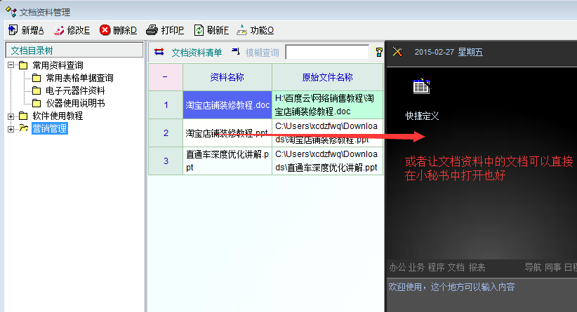 有些文档我们每天都要用到好多次,但每次打开都要先打开文档管理,再打开文档管理中文档所在的目录,然后再打开具体的文档,搞得心情好烦,能否在导航界面或小秘书中添加直接文档管理中的文档(或服务器端的文档)的功能?