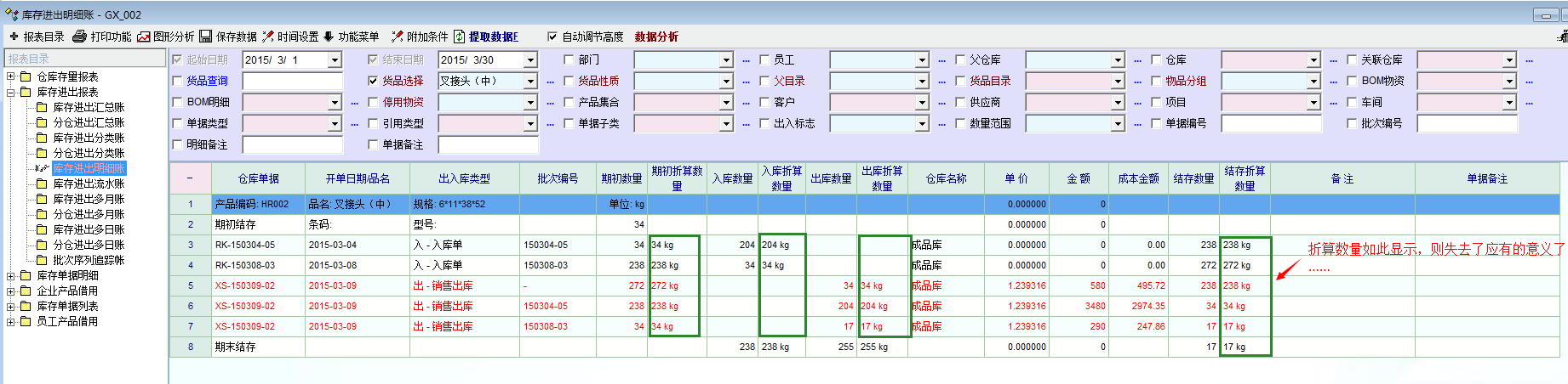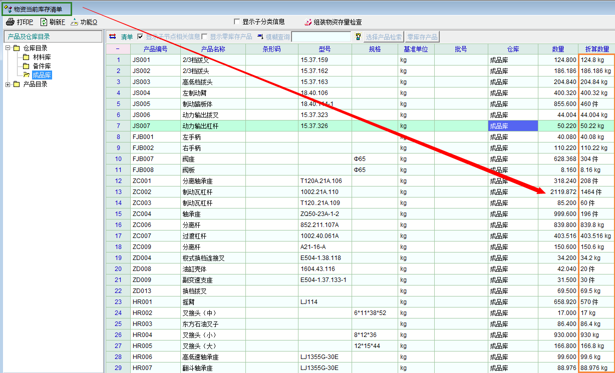 以我单位为例,我们是精密铸造企业,基础单位是kg,折算单位是“件”,许多铸件的重量都是小于1kg的,这样造成报表中无法看到产品的数量,而重量是比较抽象的,出入库和盘点时根本无法统计,因此我建议折算数量,无法折算系数多少,都应该在报表准确显示折算数量,这样才比较符合实际情况。