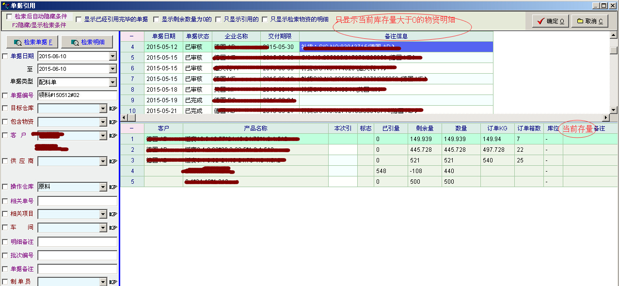 我们是加工企业,在生产实际过程中,会提前根据订单进行配料,然后同步进行原料的采购和车间的加工生产。 但是原料会分好几个批次到货,但是车间的生产不是等原料全部到货才开始的,等于有一点料就加工一点。 所以建议在出库单引用界面增加2个功能,方便出库引用。 1.多加一个选项,实现只关注当前库存量大于0的明细。 2.明细栏位增加一个显示当期存量的栏位。 TKS! |