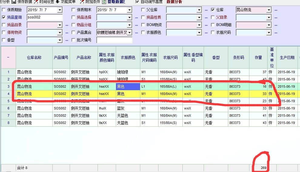 图一是该产品库存明细,图二是单据录入时显示的库存明细。希望调整后能够在录入单据时就显示该产品的明细库存。调整后显示如SOS002 黑色 M1   33件,L1  16件,而不是显示成该产品总数量269件。