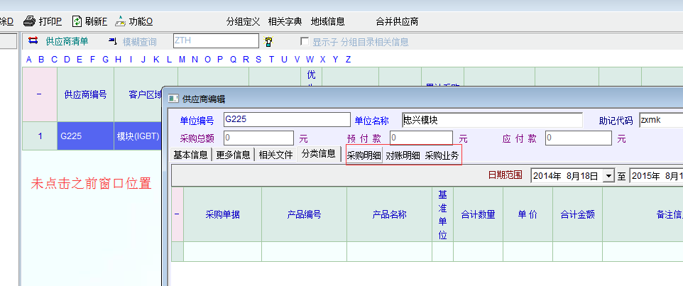 脚本中没有涉及改变窗口位置的语句、函数,但运行脚本后却改变了窗口位置。添加了脚本后,我一点击红色框内的控件,打开了的供应商编辑窗口不管在什么地方,总是跳到左上脚本这个固定的位置上去,什么原因呢?具体脚本如下: int func_f9_call() { return 1; }; int func_show_win() { string begin_date; begin_date=date_add(get_cur_date_std(),-365); gui_set_val("DateTimePicker_Beg_Date",begin_date); //gui_set_tabsheet_pos("TabSheet_Info",0); gui_set_parent("SpeedButton2","PageControl"); gui_set_parent("SpeedButton_Ebm_Check_Detail","PageControl"); gui_set_parent("SpeedButton_Io","PageControl"); gui_set_x("SpeedButton2",250); gui_set_x("SpeedButton_Ebm_Check_Detail",305); gui_set_x("SpeedButton_Io",360); gui_set_font_color("SpeedButton2",0x000000); gui_set_font_color("SpeedButton_Ebm_Check_Detail",0x000000); gui_set_font_color("SpeedButton_Io",0x000000); return 1; }; int func_create_rec() { return 1; }; int func_edit_rec() { return 1; }; int func_delete_rec() { //can_delete=1; return 1; }; int func_save_rec() { //can_save=1; return 1; }; int obj_change() { //change_obj return 1; }; |