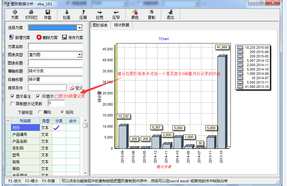 如图,现在的销售产品月报-汇总报表中,0销售量月份的统计记录在报表中是忽略不显示的。这本来也没什么问题,但在图形分析中,会产生一个问题:由于没有0销售月份的记录,没法通过图形报表直观的了解产品的销售趋势(没有了0销售的记录,时间比例就失去了可对比性)建议把销售产品月报-汇总中0销售量月份的记录也在报表中显示出来,或者在图形报表中添加一个是否显示0销售月份记录的功能。