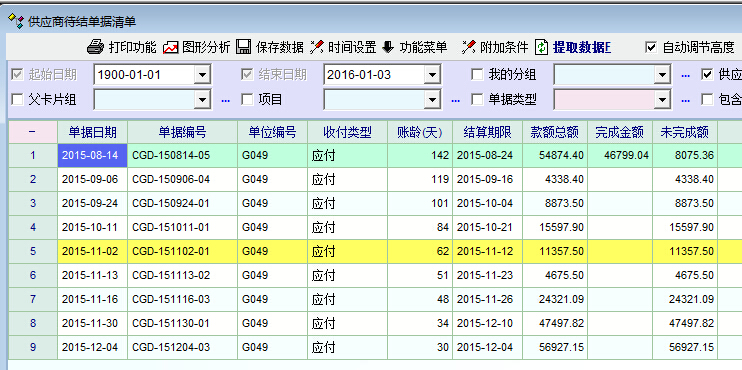 如图:图片B是供应商待续单据明细,图片A是待结账龄。