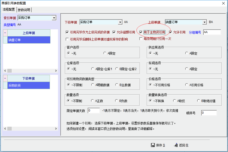 在流程里设定了 “主物资引用”,但在下级单据里没有勾选 显示主物资,此时,引用单据,只能引用最后一条的记录,未能完整引用。