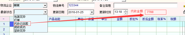 物流功能中,代收金额及发货件数是必不可少的两项,建议在模块中增加这两项功能。如图所示,在“最新状态”中添加“代收已回款”状态,当我方收到物流企业代收的货款后更新到“代收已回款”状态。则表示整个物流过程完整结束。代收金额有助于企业跟踪物流企业的代收资金是否已经回款,形成一个完整的物流流程。另外,在打印快递单时,也可以将代收金额参数传递到快递单中,直接打印出代收金额,免了打印快递单后还要再次填写代收金额的情况。